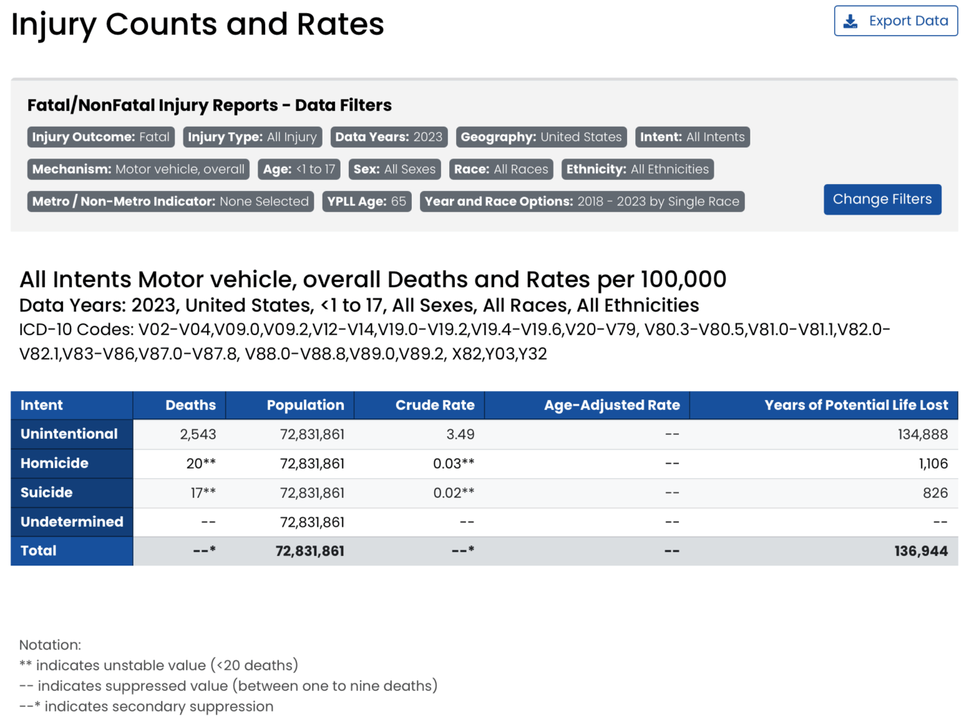 For those under 18, vehicle deaths are consistently greater than those from firearms. When you use the FBI murder data, the vehicle deaths exceed the firearm deaths for 2019, 2020, 2022, and 2023 and likely 2021, though the FBI data isn’t available for that year.