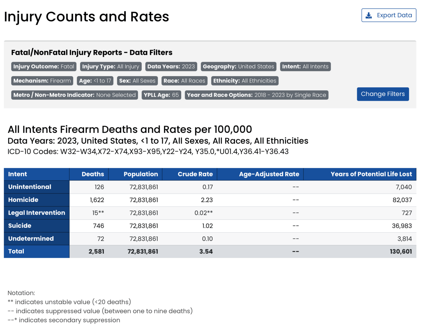 Suffocation deaths for those under 18 are greater than total firearm deaths using the FBI numbers in both 2019 and 2020 (2,253 and 2,110). It is almost the same as the number in 2022 and 2023 (2,154 and 2,042).