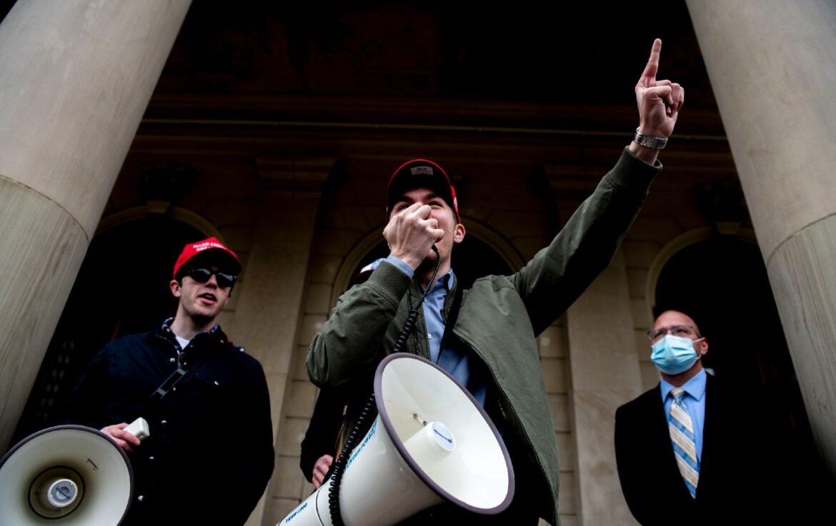White nationalist Nick Fuentes speaks during a rally at the Capitol in Lansing, Michigan, November 2020.