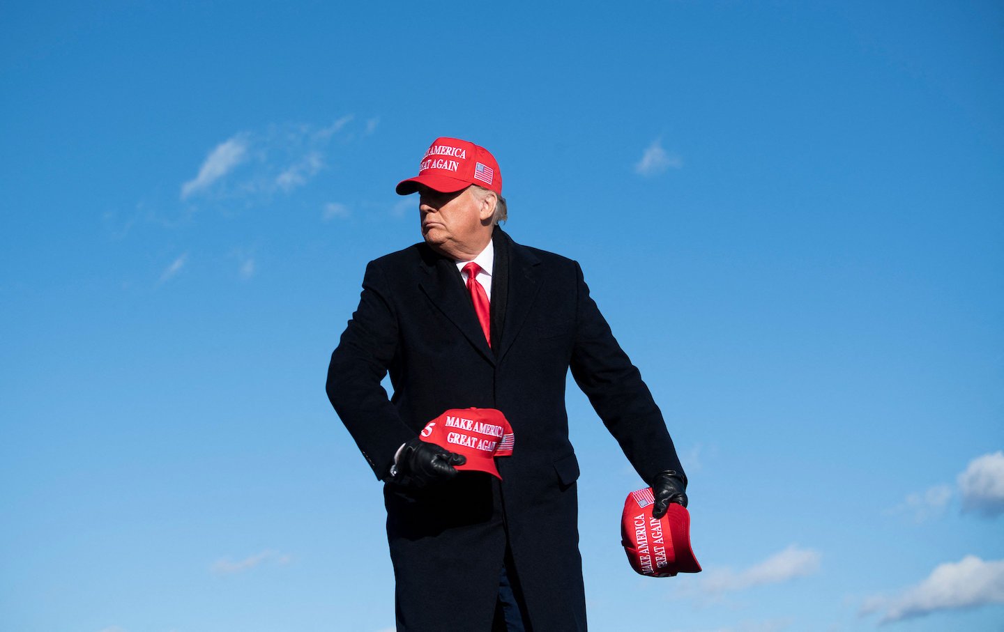 Donald Trump throws hats to supporters during a Make America Great Again rally at Wilkes-Barre Scranton International Airport.