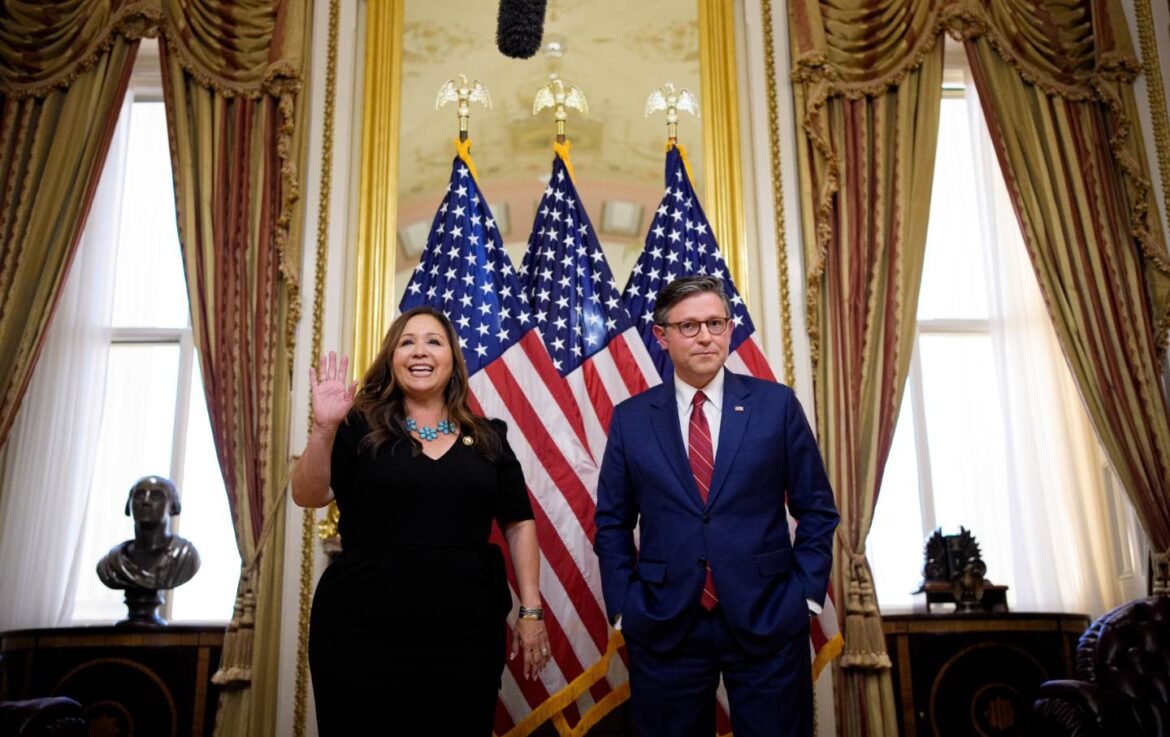 Representative Adelita Grijalva, Democrat of Arizona, was sworn in by House Speaker Mike Johnson seven weeks after her election.