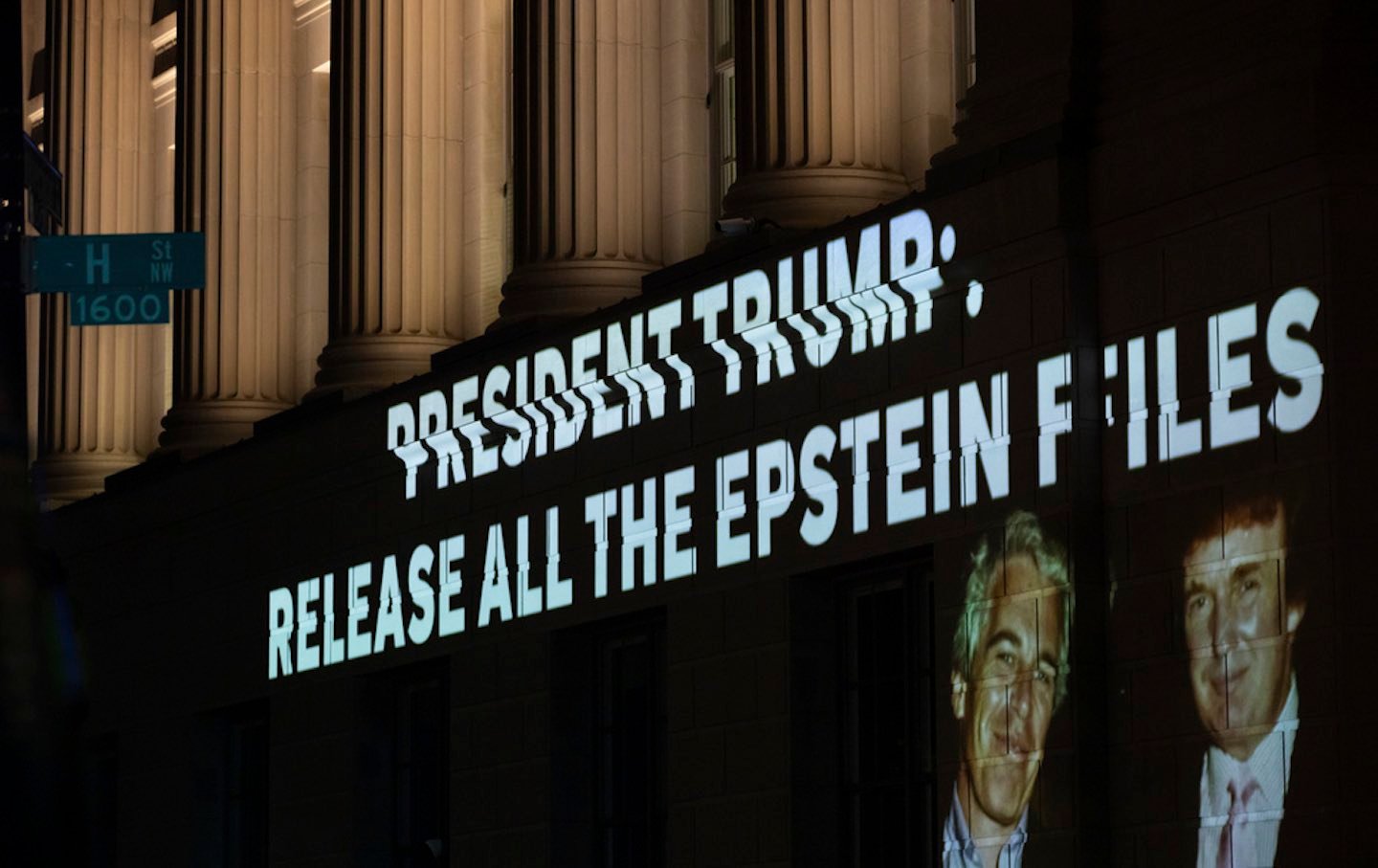 A projection onto a building near the White House demands Donald Trump release the Epstein files in July 2025.