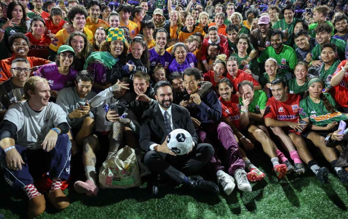 Zohran Mamdani poses for a group photo at “The Cost of Living Classic” soccer tournament on October 19, 2025, in New York City.