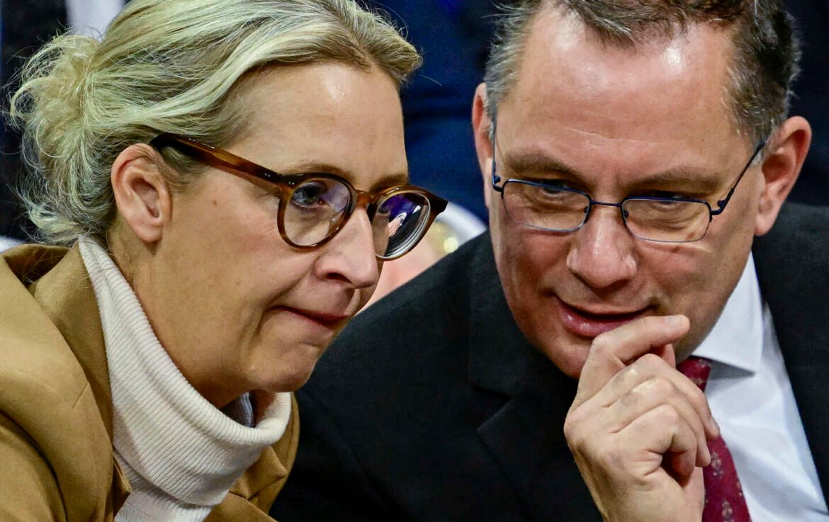 Co-leaders of the far-right Alternative for Germany party (AfD) Alice Weidel (L) and Tino Chrupalla (R) in Berlin on December 5, 2025.
