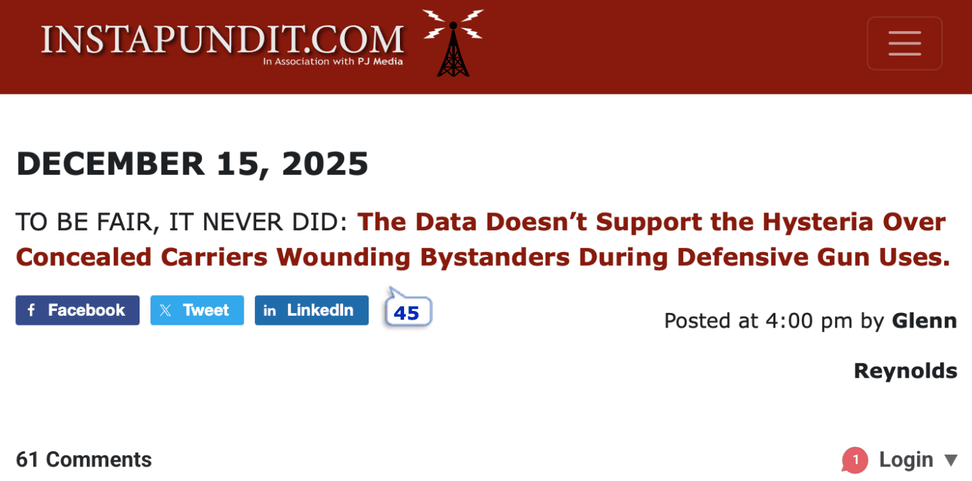 Glenn Reynolds, “TO BE FAIR, IT NEVER DID: The Data Doesn’t Support the Hysteria Over Concealed Carriers Wounding Bystanders During Defensive Gun Uses,” Instapundit.com, December 15, 2025.