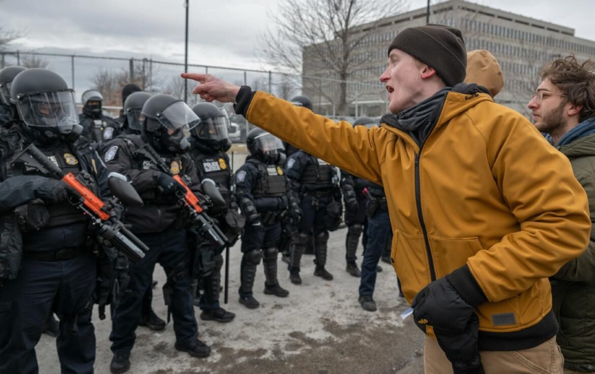 Demonstrators protest Immigration and Customs Enforcement activity outside the Bishop Henry Whipple Federal Building in St. Paul, Minnesota,