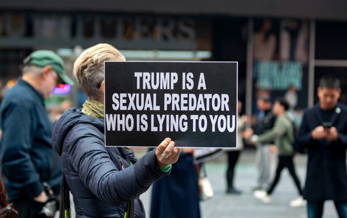 A demonstrator carries sign in support of the victims of sex offender Jeffrey Epstein and against Donald Trump’s refusal to release what are known as the Epstein files in New York’s Times Square.
